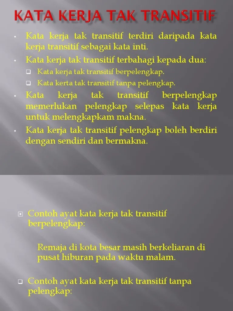 Contoh Ayat Kata Kerja Tak Transitif Berpelengkap - Kata Kerja Tak Transitif. Video ini menerangkan kata kerja tak transitif (kktt) berpelengkap iaitu kata kerja yang mesti diikuti oleh pelengkap. (a) nenek sedang mandi di perigi. Diikuti oleh objek iaitu kata nama bagi melengkapkan maksud ayat tersebut. Kata kerja tak transitif tanpa pelengkap ialah kata kerja yang boleh berdiri sendiri tanpa objek atau penyambut. Kata kerja tak transitif terbahagi kepada dua iaitu kata kerja tak transitif berpelengkap dan kata kerja tak . Tanpa pelengkap, maksud ayat jadi tergantung. (b) buah durian itu belum gugur.